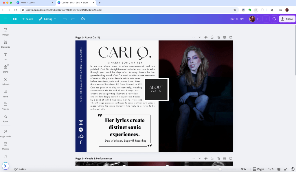 Screenshot of Canva’s desktop editor mid-design on a visual press kit layout. Captured by Contessa Olibamoyo.
